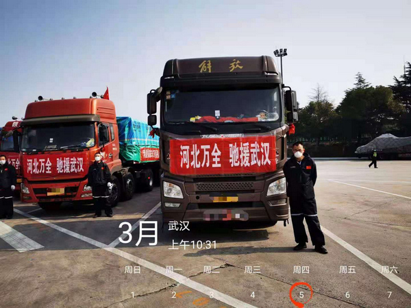 2020年3月,杨占成(右1)向武汉运送抗疫物资。