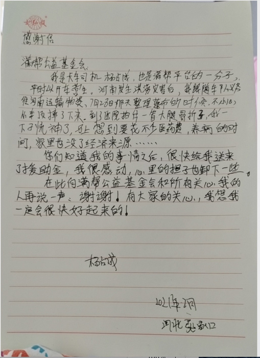 收到援助款后,杨占成激动地表示:“知道我的事情之后,你们第一时间联系我慰问我,又很快给我送来了援助金,我很感动,心里的担子也卸下一些……非常感谢满帮和基金会!”
